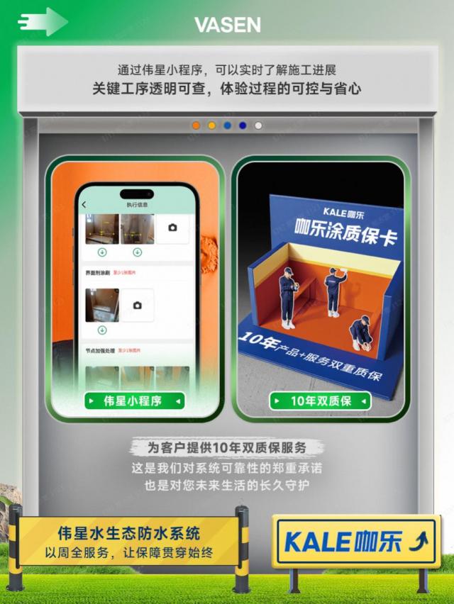 咖乐防水率先在行业内推出“产品+施工”双质保服务,承诺10年质保。这不仅是对产品质量的自信,更是对标准化施工服务的兜底保障,让消费者真正实现“无漏无忧”。