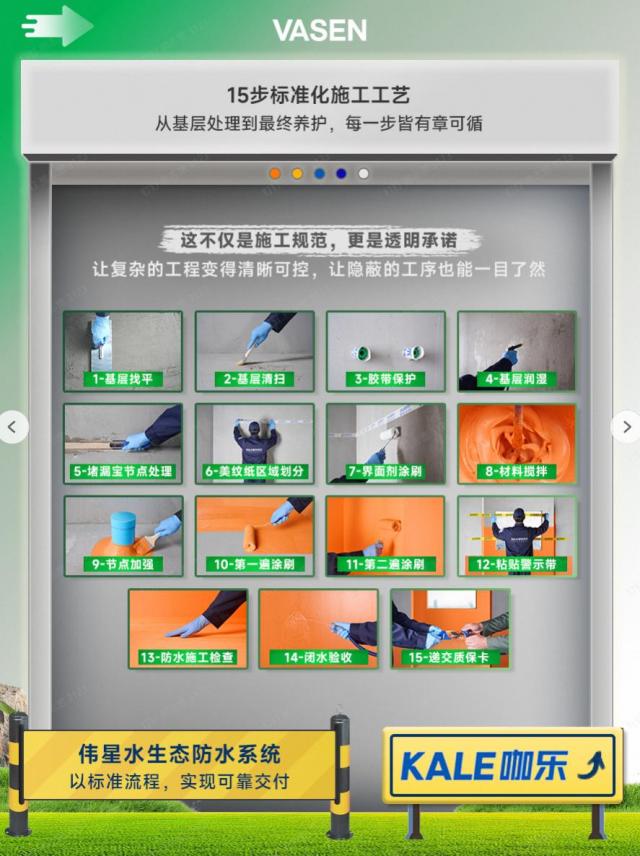再好的材料也离不开规范的施工。咖乐创新推出“咖乐涂”标准化施工服务,通过15道严苛工序,将防水从“隐蔽工程”变为“透明工程”。