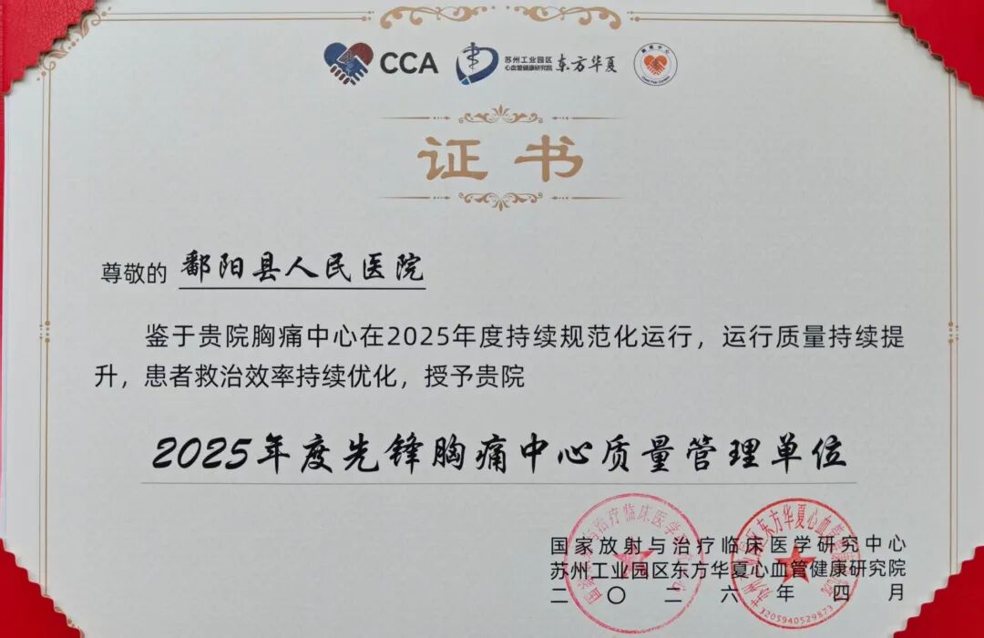 近日,从国家放射与治疗临床医学研究中心、苏州工业园区东方华夏心血管健康研究院及第十五届中国胸痛中心大会(CCPCC15)传来喜讯,鄱阳县人民医院胸痛中心凭借规范诊疗流程、扎实质控管理与高效救治能力,一举斩获基层版胸痛中心 “先锋单位” 及2025年度先锋胸痛中心质量管理单位双项殊荣,彰显县域胸痛救治硬核实力。