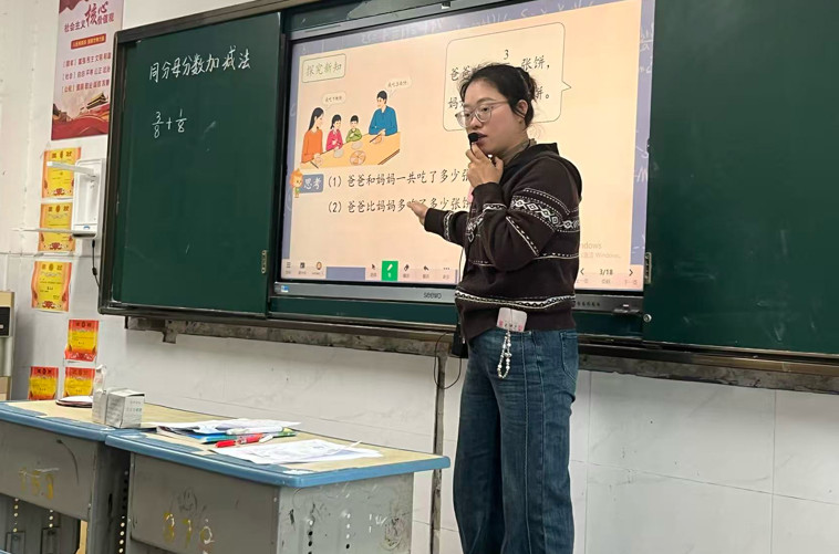 码头小学周蓉老师讲授五年级数学《同分母分数加减法》,巧用数形结合方式,深入浅出剖析算理,课堂扎实高效。