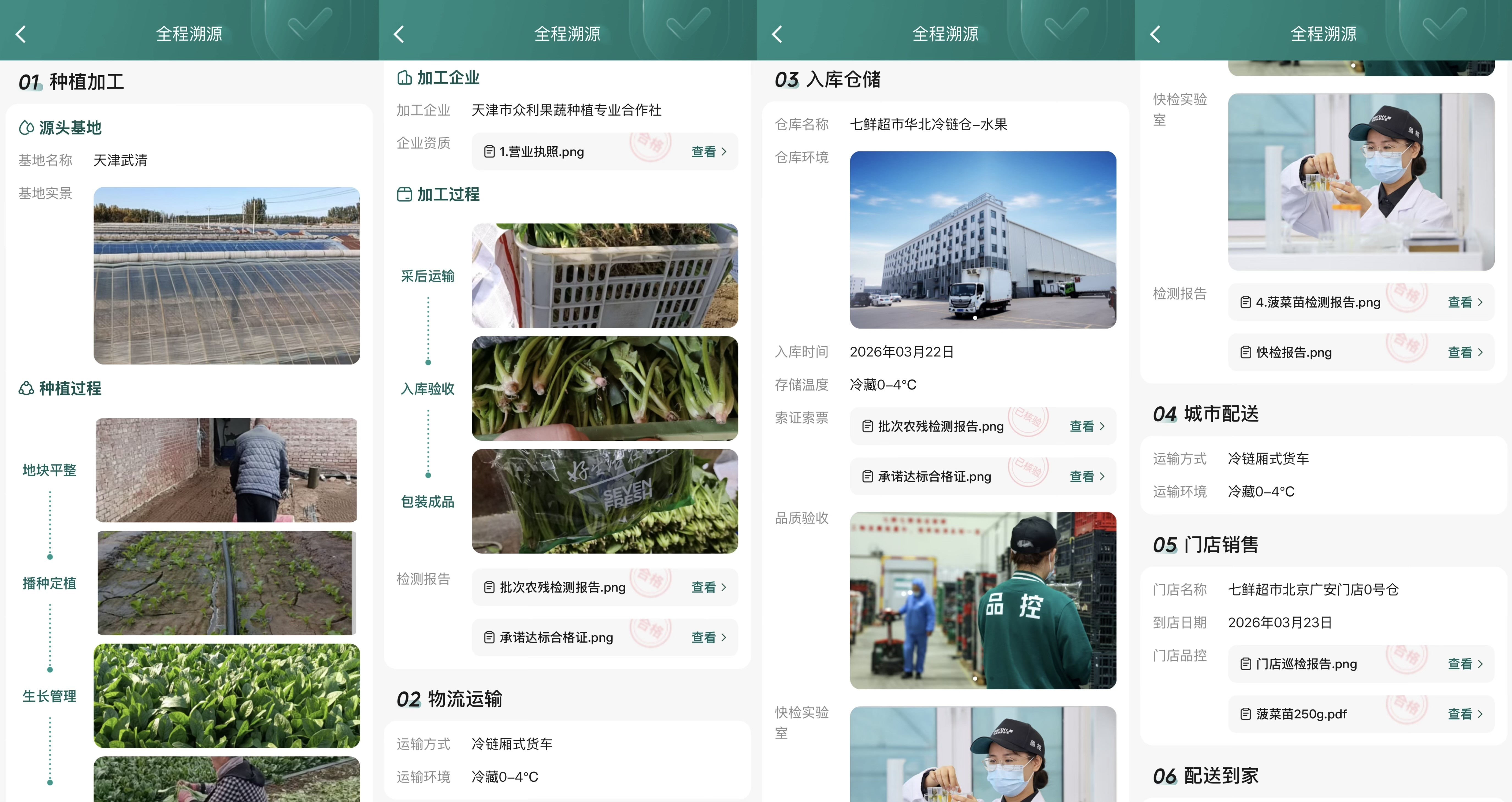 以餐桌常见且农残风险较高的菠菜为例,京东七鲜“24小时鲜菠菜苗”的全程溯源界面,明确标注其源头为天津武清优质菠菜种植基地,消费者不仅能直观查看种植基地的实景画面、采收与加工现场照片,更能精准核查所购批次蔬菜的全链路农残检测报告——从基地采收后的初检,到仓储入库的复检,再到门店上架前的终检,三轮严格检测的报告全程公示,形成环环相扣的安全闭环。同时,运输方式、配送及到店日期等关键流通信息同步呈现,彻底打破生鲜流通的“信息黑箱”,让消费者真正“看透盘中餐来时路”,买得安心、吃得放心。
